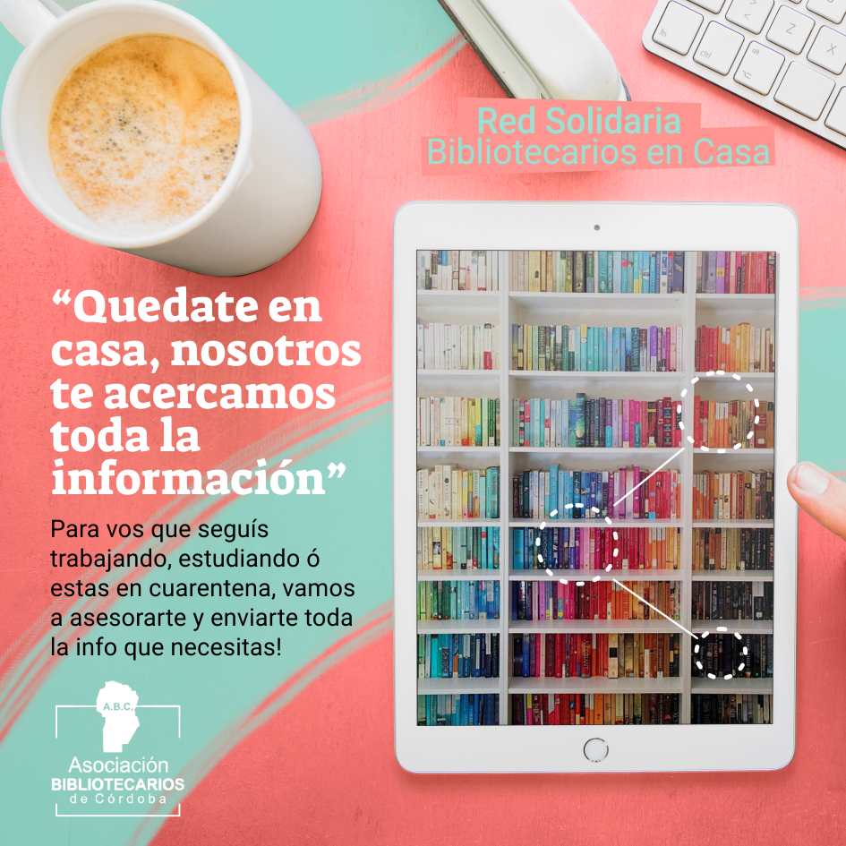La Asociación Bibliotecarios de Bibliotecarios de Córdoba en el mes de abril creo la Red Solidaria #Bibliotecarios en Casa, que bajo la consigna “Quédate en casa, nosotros te acercamos toda la información”, tiene como objetivo principal ser una campaña solidaria destinada a cumplir y promover el derecho de acceso a la información para toda la ciudadanía. Destinada a las personas que siguen trabajando, estudiando y a la comunidad que se encuentra en cuarentena, bajo el Aislamiento Social Preventivo y obligatorio que rige desde finales del mes de marzo.